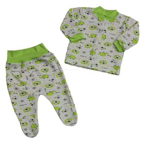 Комплект состоит из кофточки с воротничком, с длинным рукавом, спереди на кнопочках и ползунков на широкой резинке.