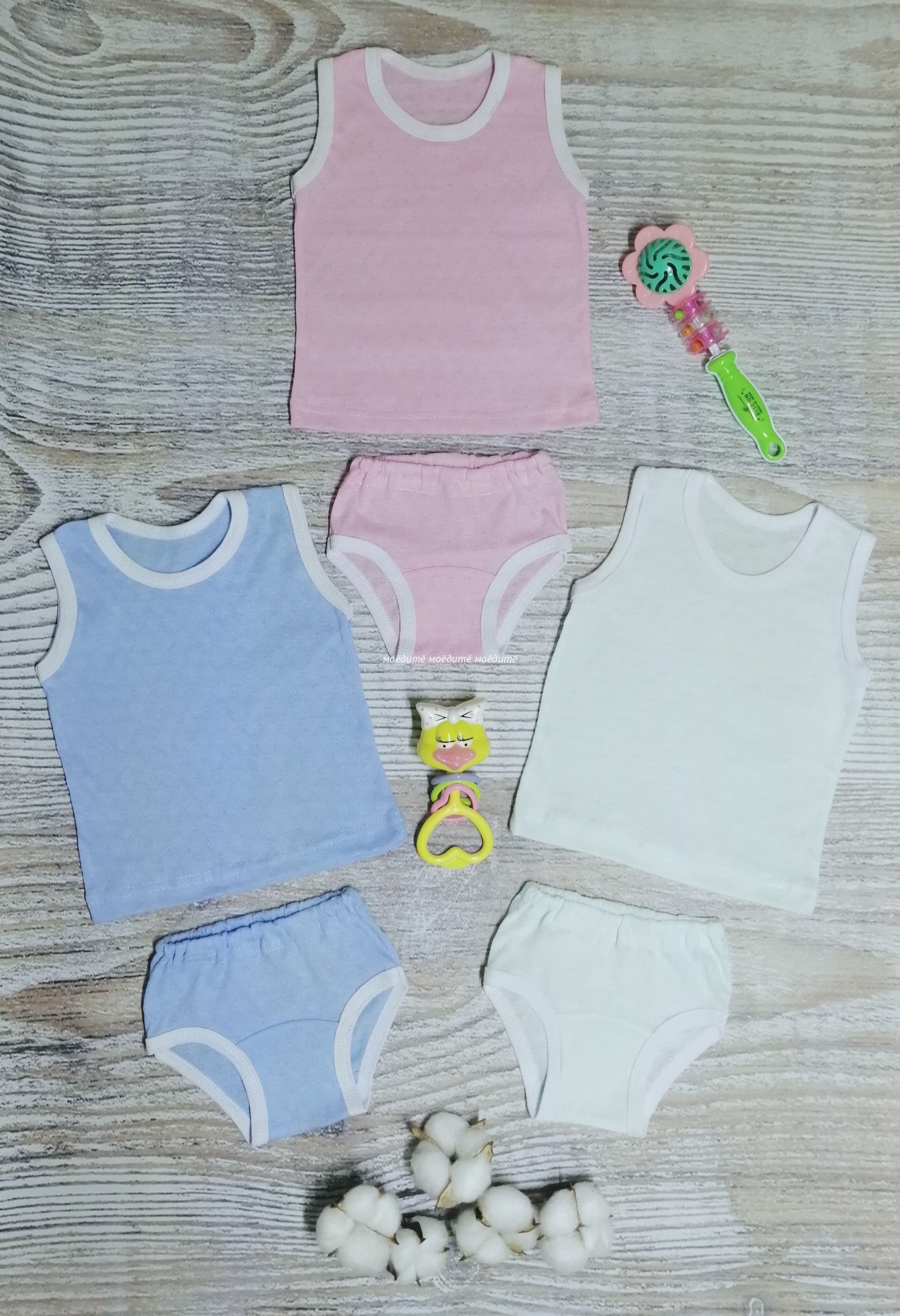 Комплект состоит из маечки и трусиков. Выполнен из ажурной кулирки.