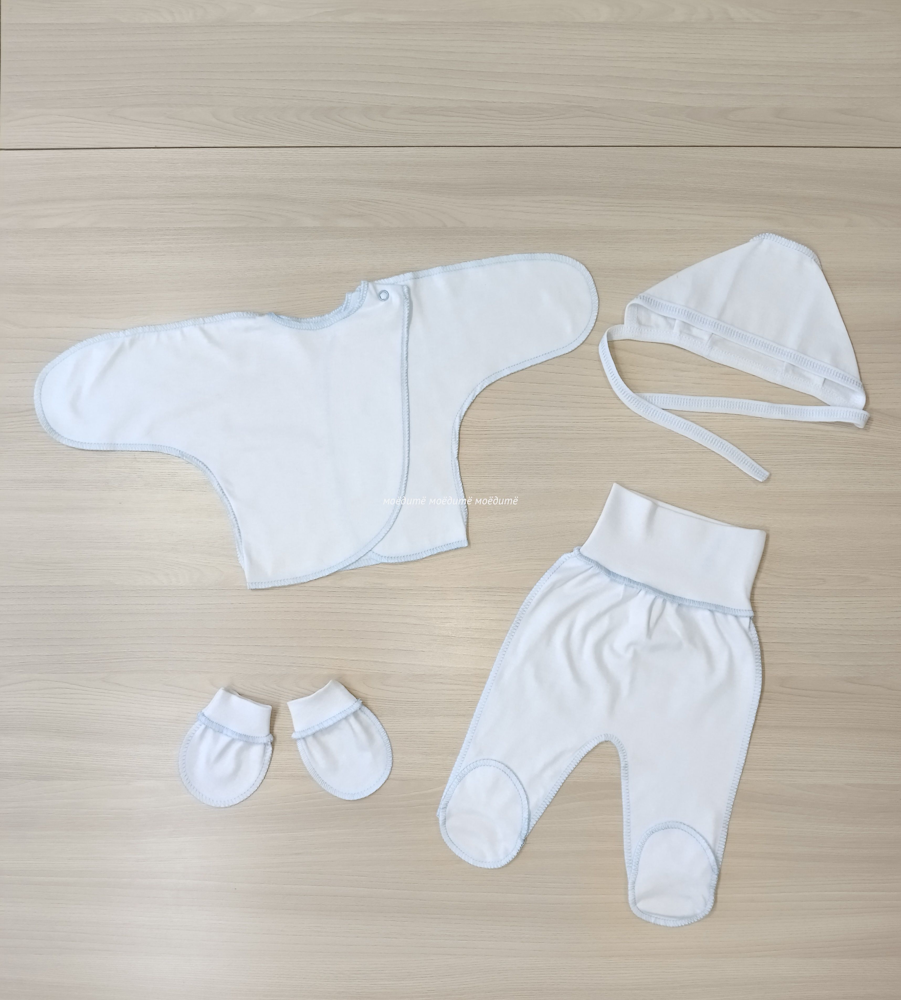 Комплект белый с голубой обработкой швов.